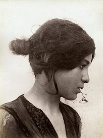 1909 / Cette jeune femme (fille?) a dû paraître assez bien faite et jolie pour être photographiée nue et diffusée en carte postale. On imagine le commentaire au dos de la carte : "Je suis bien arrivé(e) et je vous envoie cette photographie d'une autochtone " etc ... Sous couvert d'information touristique, on en a exhibé des femmes des pays "colonisés" dans la plus grande négation de leur culture et de leur religion ... ! Et des hommes aussi d'ailleurs. On sait que le grand-père du joueur de foot Christian Karembeu avait été "exposé" avec d'autres gens de son village de Nouvelle Calédonie dans une reconstitution de village, à la dernière Exposition coloniale qui a eu lieu à Paris en 1931.