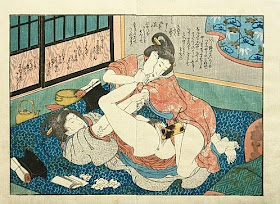 "Cette estampe représente deux femmes se pénétrant avec le même phallus artificiel (harikata). Elles se tirent l’une vers l’autre par les bras, ce mouvement leur permet ainsi d’enfoncer plus profondément le harikata. Kunisada a fait habilement soulever par sa partenaire la jambe droite de la jeune femme allongée, permettant au spectateur d’observer au mieux la pénétration. Au regard de la couleur et des formes géométriques que l’on peut apercevoir dessus, il semblerait que le harikata soit en écailles de tortue " (texte qui accompagnait l'estampe).